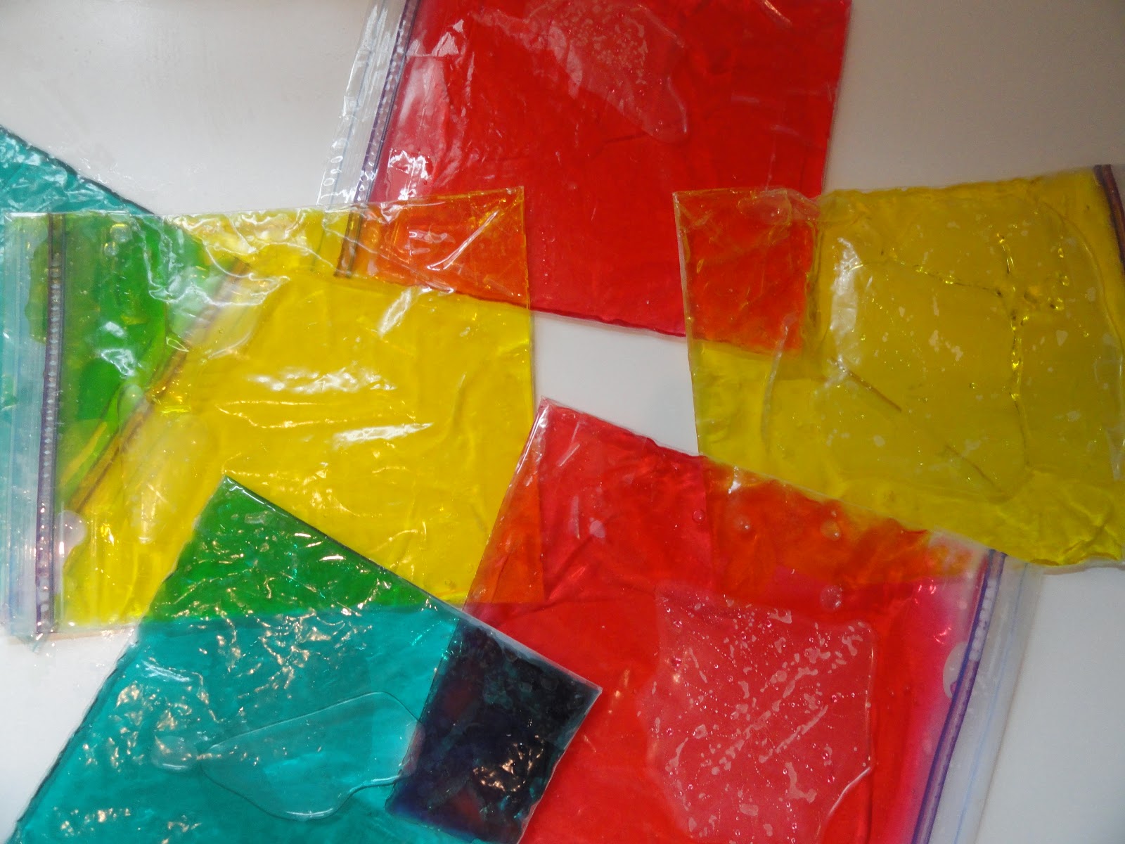 Procedures: Pour about 1/3 cup of corn syrup with a few drops of food coloring into each bag.